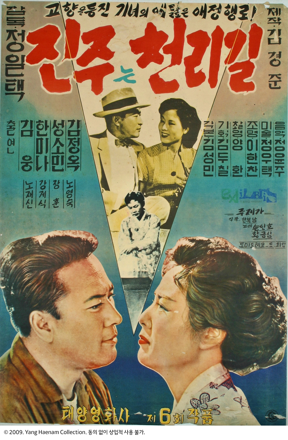 정일택 감독의 이 영화는 김웅, 한미나, 성소민, 양일민 등이 출연했다. 영화 <진주는 천리길>은 1958년 8월 27일 개봉된 영화이다. 김웅과 한미나는 서로 살아한다. 김웅은 청운의 뜻을 품고 서울로 향한다. 김웅을 사랑한 한미나도 김웅을 따라 서울로 간다. 하지만 전화가 거의 없던 시절 둘은 만날 길이 없다. 한미나는 기생이 되고, 김웅은 자신의 꿈을 접고 고향인 진주로 되돌아간다. 김웅은 있을 줄았던 한미나를 찾지만 진주를 떠났다는 이야기만 있고 소식이 끊어졌다고 한다. 결국 김웅은 다른 여자와 결혼한다. 얼마 후... 술집에서 오직 김웅만을 생각하며 험한 세월을 보내면 많은 돈을 모은 한미나가 찾아온다. 하필 그날은 김웅의 결혼식 날이었다. 소식들을 한미나는 결혼식을 바라보면 눈물짓는다.